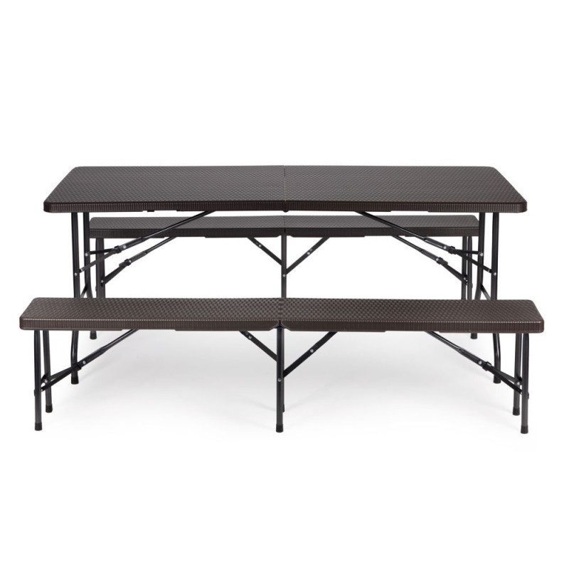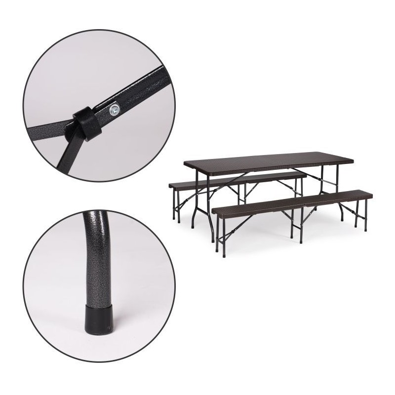 Komplet mebli dla 8 osób składa się ze stołu cateringowego i dwóch ławeczek. Zestaw posiada stabilną metalową konstrukcję, blat i siedziska o wzorze rattanu wykonano z odpornego materiału HDPE. Stół i ławki posiadają blokadę zabezpieczającą je przed przypadkowym złożeniem, dodatkowo istnieje możliwość złożenia kompletu w walizkę do łatwego transportu. Atutami zestawu są także uchwyty transportowe oraz nogi zakończone stopkami ochronnymi. Meble są odporne na warunki atmosferyczne. Średnica nóg stołu to 25 mm a ławki 22 mm, maksymalne obciążenie stołu wynosi 100 kg.