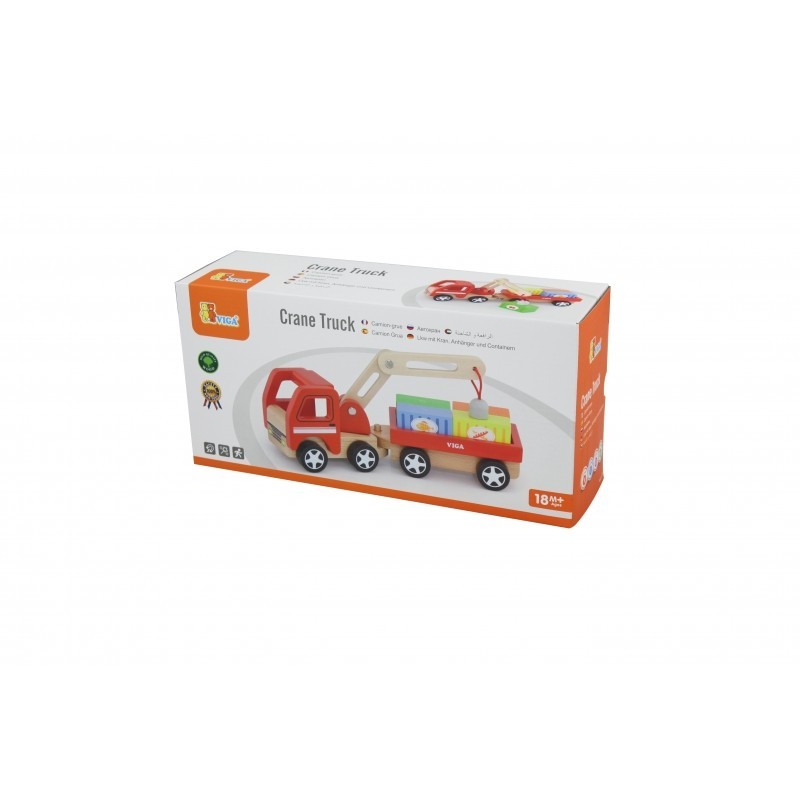 Drewniany Dźwig posiada ruchome ramię i 4 drewniane kontenery wyposażone w magnesy, dzięki którym można je podnosić. Podstawa dźwigu jest obrotowa. Kolorowy dźwig z kontenerami cieszy oko i zachęca do zabawy. Przyczepkę można odpinać od pojazdu, ściągając ją z drewnianego kołeczka.