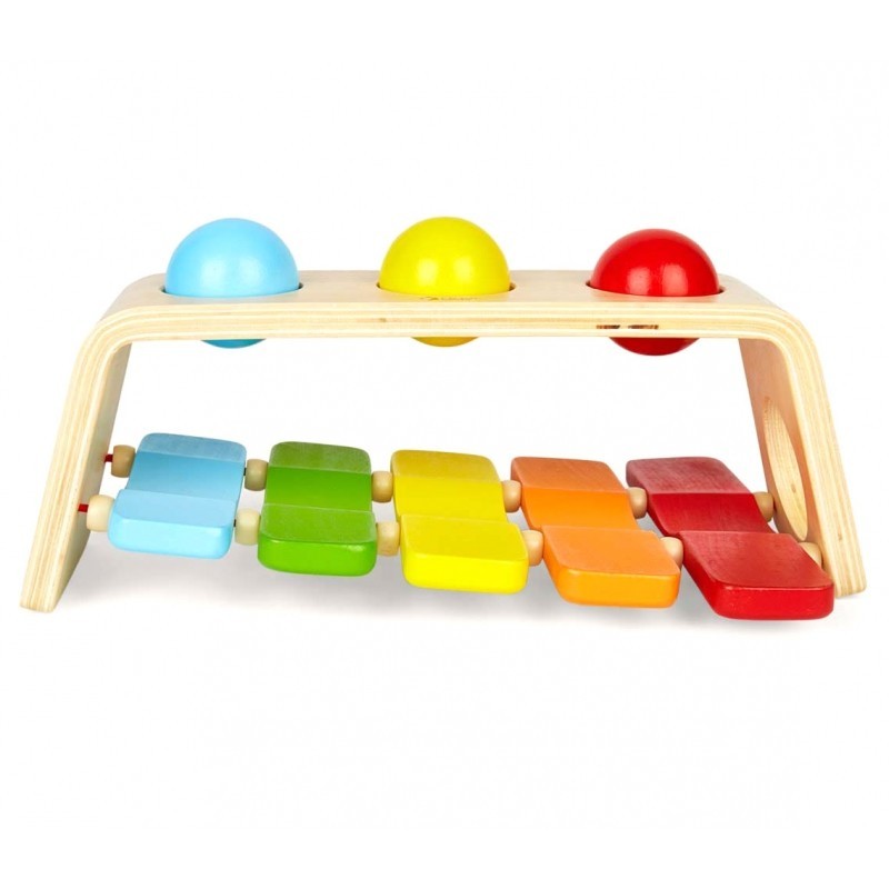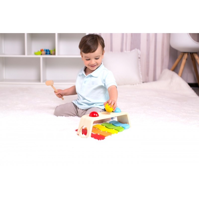 Przybijanka Cymbałki Classic World to świetna zabawka wielofunkcyjna, która pozwala dziecku na 2 zgoła różne aktywności. Zabawka składa się z młoteczka, który służy do wbijania kolorowych kulek. Wbite kulki uderzają w znajdujące się poniżej cymbałki, oraz wydają dźwięki, a następnie wylatują z zabawki przez otworek. Wystarczy obrócić zabawkę, by mieć przed sobą klasyczne dzwonki - uderzaj młotkiem i graj!