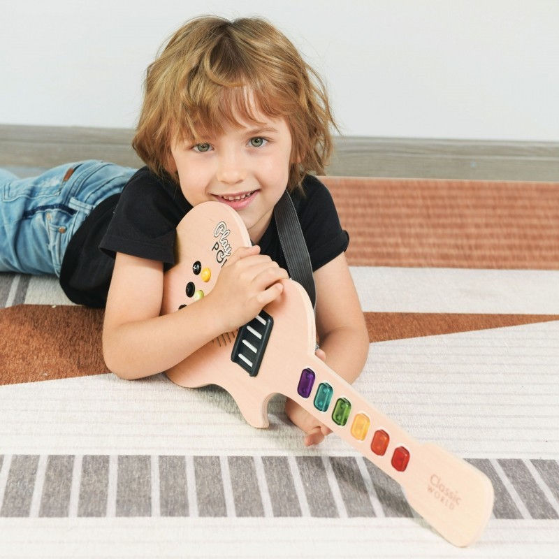 Rewelacyjna gitara elektryczna dla małych muzyków została wykonana z wysokiej jakości lakierowanego drewna. Kolorowe przyciski na gryfie wydają kolejne dźwięki gamy, dzięki czemu możemy stworzyć piękną melodię. Dodatkowe przyciski pozwolą na regulacje głośności i tworzenie rożnych efektów dźwiękowych. W zestawie znajduje się również pasek, który pozwoli dać małym gitarzystom prawdziwy koncert. Zabawka rozwija zmysł słuchu, zdolności poznawcze, rytmikę, wrażliwość na muzykę, oraz wyobraźnię. Jest to świetny pomysł na prezent dla dzieci już od 3-go roku życia.