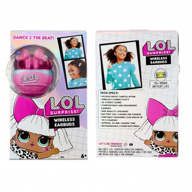 Słuchawki bezprzewodowe na licencji L.O.L. Surprise to połączenie dźwięku stereo 3D, świetnego, dziewczęcego designu i wygodnego użytkowania. Skonstruowano je tak, aby pasowały do uszu większości dzieci, dołączając parę miękkich i komfortowych, silikonowych tipsów. Litowe akumulatory ładują się w pełni w niecałe 45 minut i mogą działać nieprzerwanie przez około 5 godzin. Co ważne, etui do słuchawek umożliwia 5 dodatkowych doładowań, dzięki czemu mamy pod ręką sprzęt, który możemy użytkować 25 godzin bez konieczności podłączania do prądu!