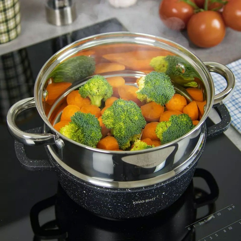 Uniwersalny wkład do gotowania na parze do garnka o średnicy 24 cm. Produkt formy KINGHOFF. Funkcjonalny, przeznaczony dla osób które dbają o zdrowe odżywianie. Posiłki z takiego naczynia nie są wypłukiwane przez wodę z naturalnych witamin oraz minerałów jak to ma miejsce w tradycyjnym garnku. Wkład jest uniwersalny można stosować na garnkach każdego rodzaju.