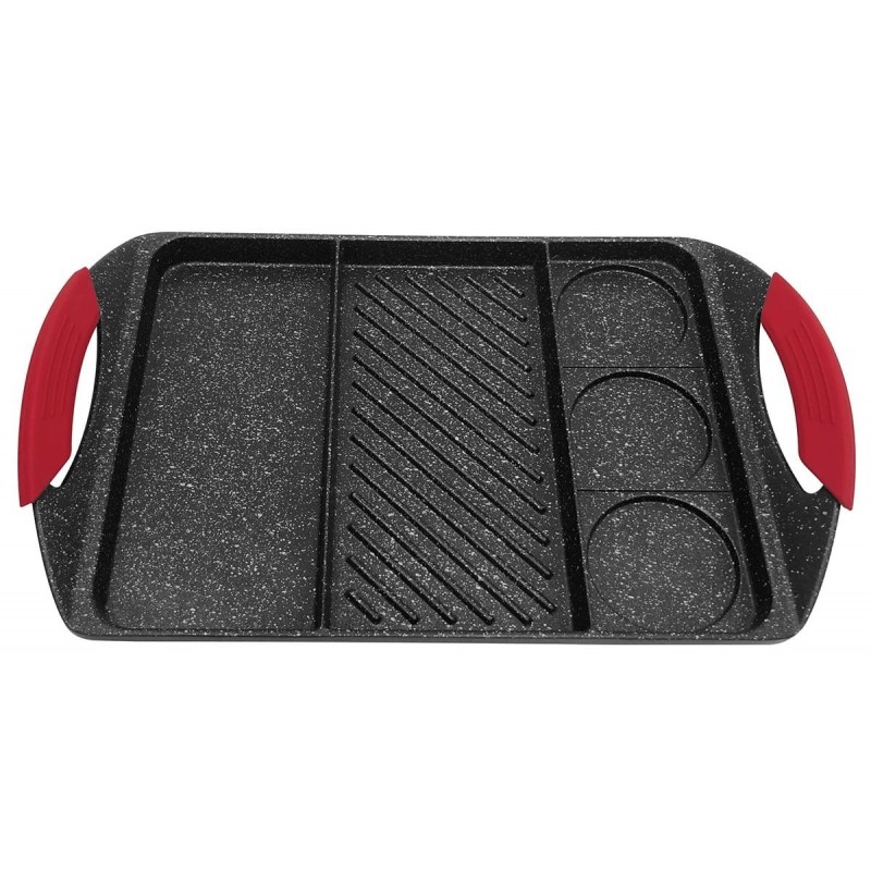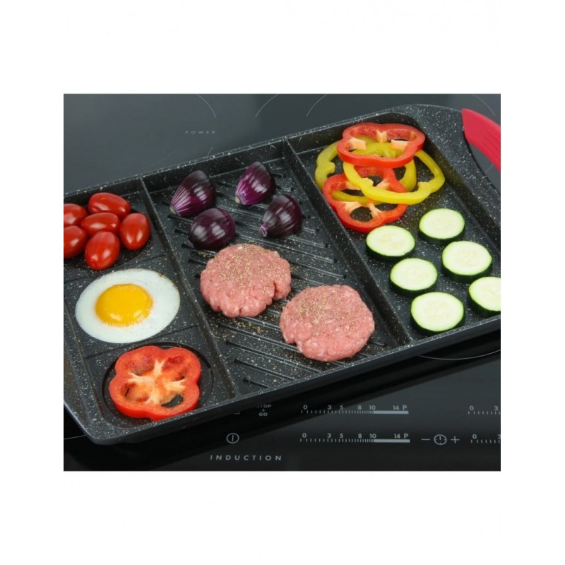 - Odseparowane pola umożliwiają grilowanie kilku potraw jednocześnie a nawet przyrządzenie jajek sadzonych.