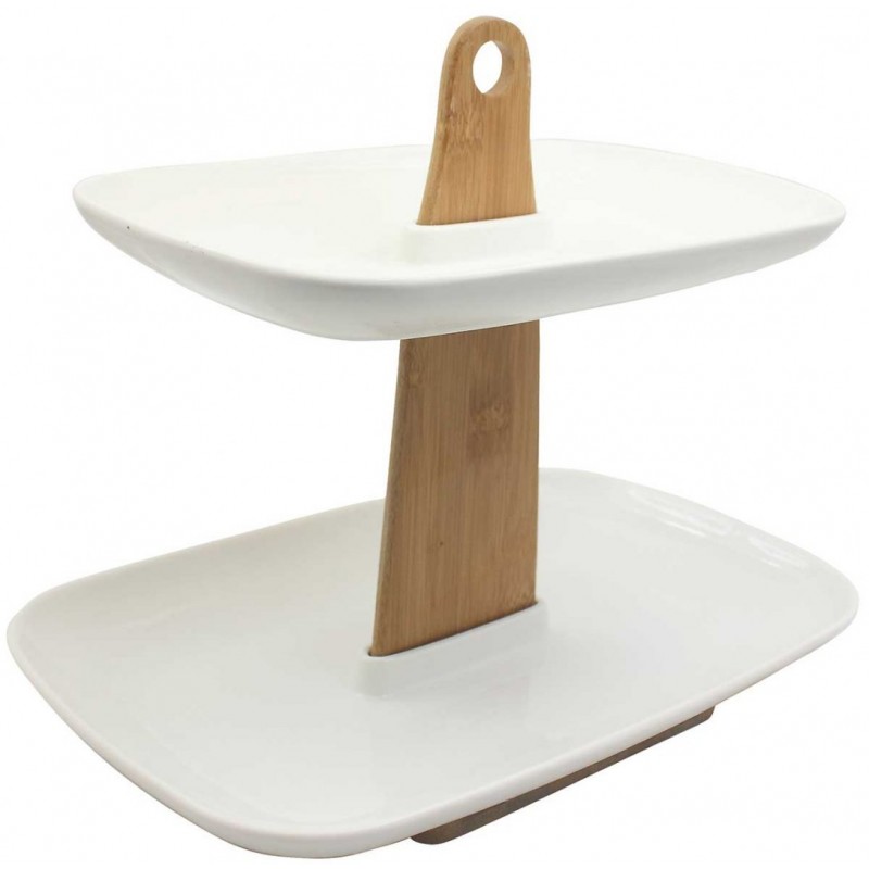 Dwupoziomowa patera na przekąski, owoce, ciasta firmy KASSEL. Wykonana z ceramiki w kolorze białym oraz stojaka z drewna bambusowego.