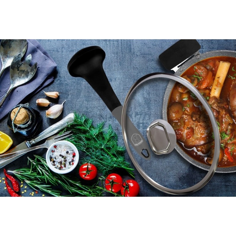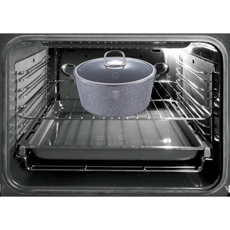 Masywny korpus z najwyższej jakości kutego aluminium gwarantuje doskonałe przewodzenie ciepła oraz właściwości akutermiczne. Garnek przystosowany jest do każdego rodzaju kuchni (także indukcyjne). Silikonowe, zdejmowane nakładki na uchwyty zapewniają pewne trzymanie w każdych warunkach oraz umożliwiają użycie garnka w piekarniku. Granitowa powłoka wysokiej klasy ścieralności sprawia, że naczynia są wyjątkowo odporne na wszelkie zarysowania i trwałe.