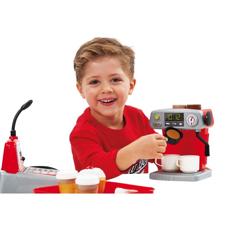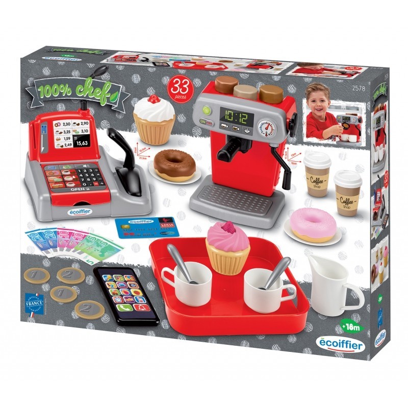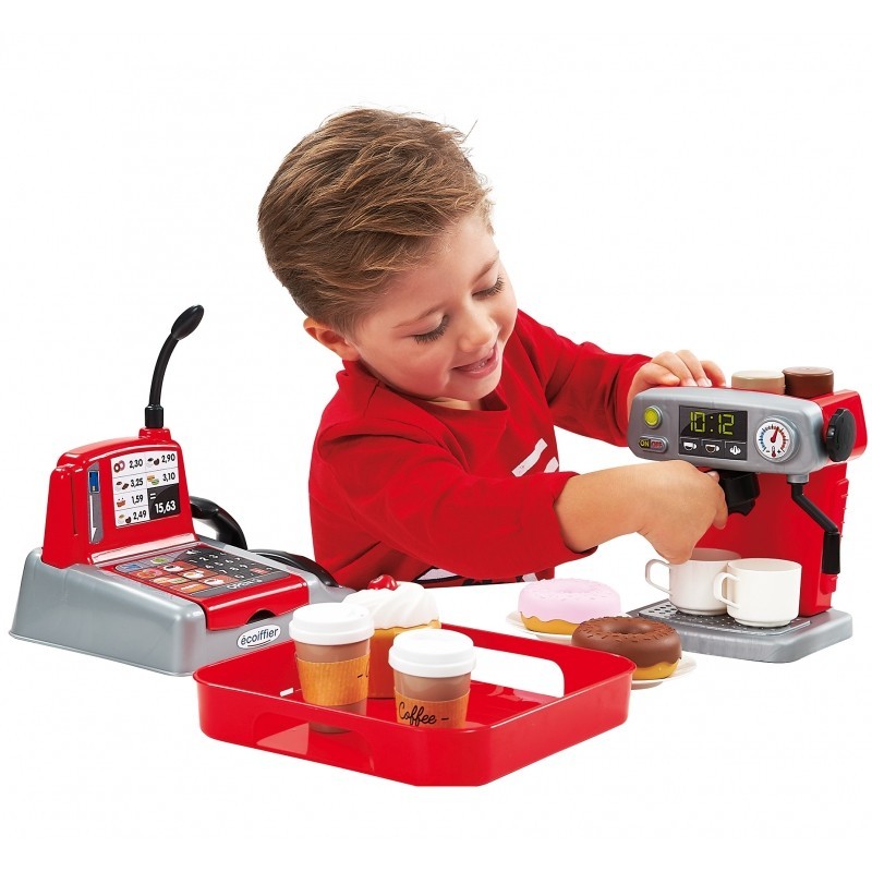 Ecoiffier Mała Kawiarnia z Kasą to świetny zestaw na prezent dla każdego malucha. Dziecko będzie mogło wcielić się w rolę prawdziwego właściciela przytulnej kawiarni. Czas na przygotowanie słodkości dla swoich klientów. Nie można zapomnieć również o pysznej kawie czy herbacie. Teraz to twoja pociecha będzie częstować gości oraz kolekcje swoich miśków i lalek. Zabawy nie będzie końca. Dziecko pobudzi swoją dziecięcą wyobraźnię oraz nauczy się odpowiedzialności.