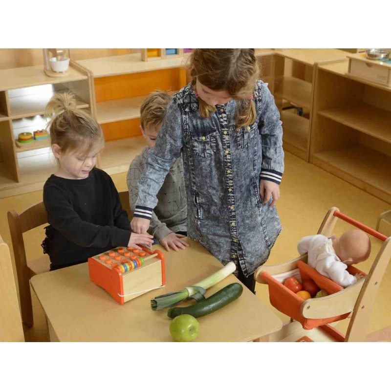 Dziecko może wrzucać niezbędne produkty spożywcze do wózka - jak na prawdziwych zakupach. Następnie uda się do kasy, gdzie użyje zabawkowych pieniędzy do zapłaty. Dzięki tej zabawce, dziecko nauczy się robić samodzielnie zakupy. Z pomocą rodzica maluch dowie się jak rozpoznać świeże owoce i warzywa, oraz jak liczyć pieniądze i płacić w sklepie.