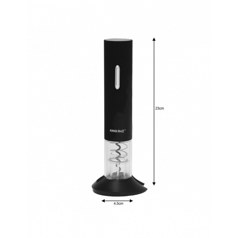 Korkociąg elektryczny do wina KINGHOFF którym bez problemu otworzysz każdą zakorkowaną butelkę. Zasilany na baterie i bezprzewodowy, co pozwala Ci swobodnie z niego korzystać, bez potrzeby podłączania go do stałego źródła zasilania. Do zestawu dołączony jest również obcinacz do folii będący jednocześnie podstawką na blat stołu.