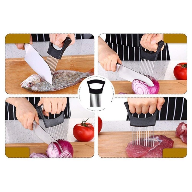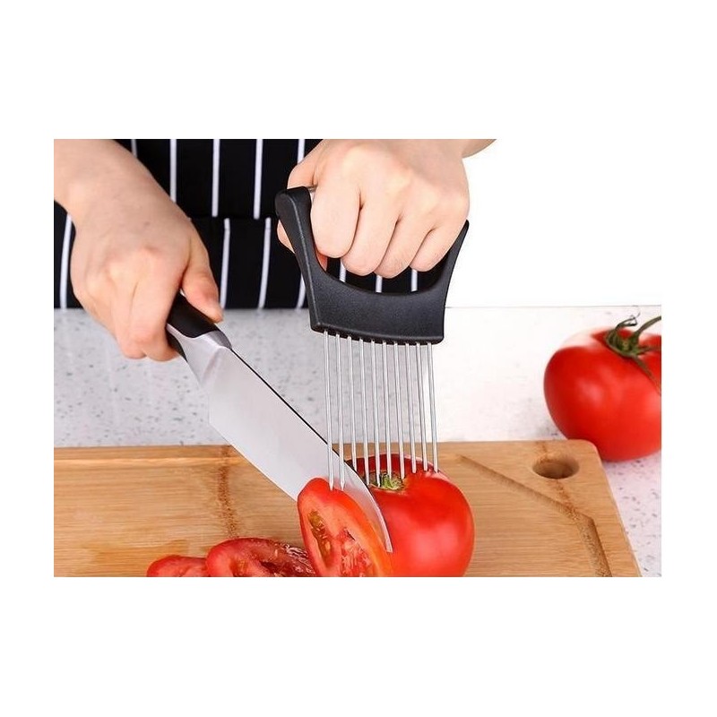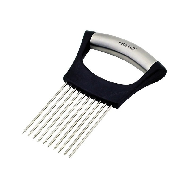 Chwytak do krojenia cebuli, pomidorów oraz innych warzyw wykonany ze stali nierdzewnej i tworzywa. Znajdzie także zastosowanie przy porcjowaniu mięsa oraz ryb. Można go wykorzystać również jako nakłuwacz do zmiękczania mięsa przed smażeniem lub pieczeniem.