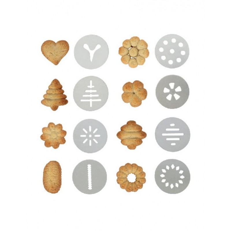 W zestawie 8 tarcz do produkcji ciastek i 8 tarcz do dekoracji.