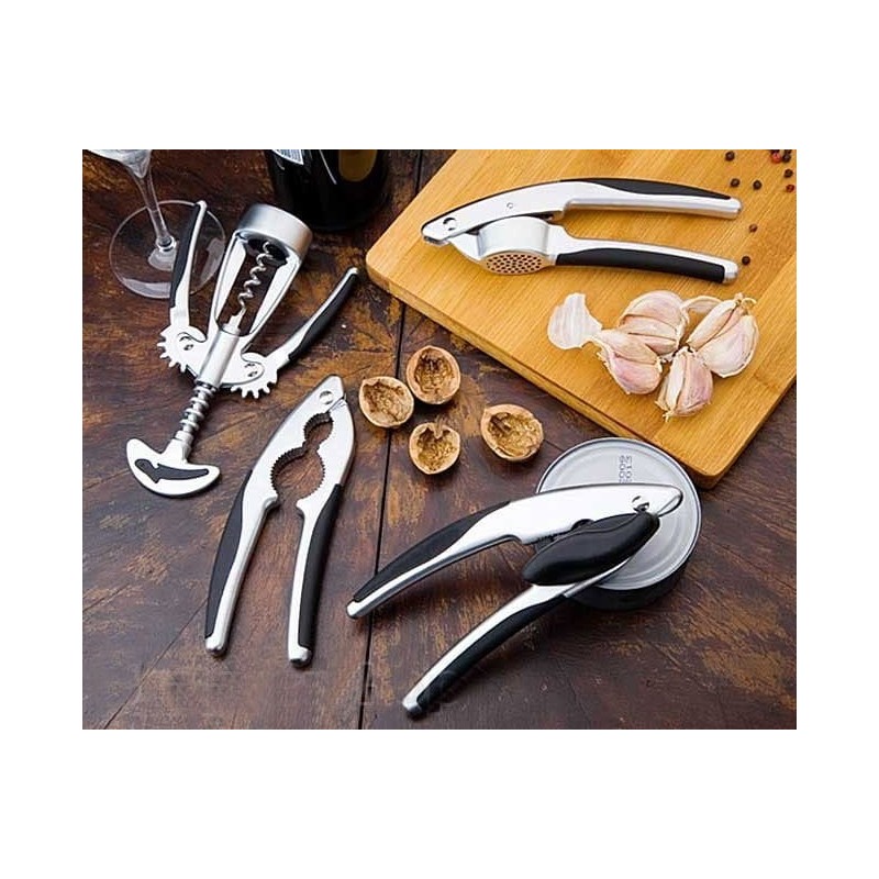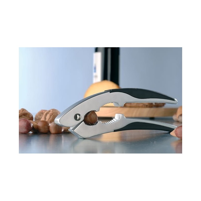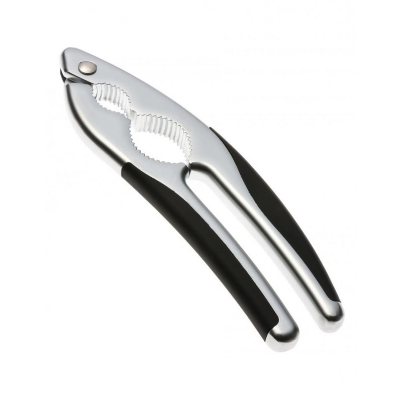 Stalowy dziadek do orzechów średniej wielkości (włoskie, laskowe). Ergonomiczne rączki zapewniają pewny chwyt i łatwe rozłupywanie orzechów. Kolor srebrny, SATYNA.