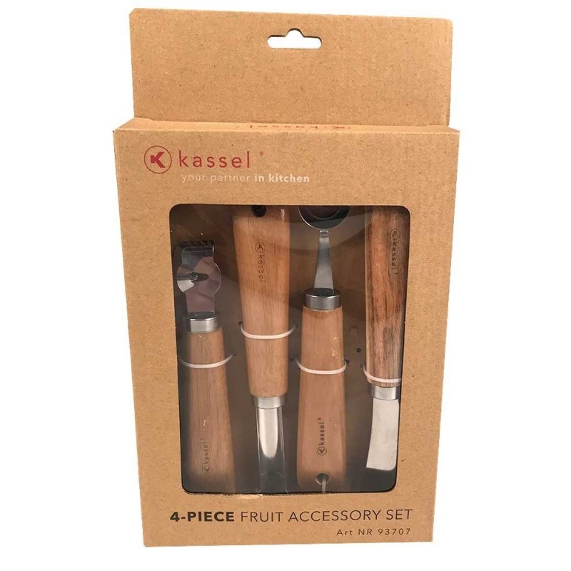 4 elementowy zestaw przyborów kuchennych firmy KASSEL. Unikatowe drewno akacjowe w połączeniu z błyszczącą stalą nierdzewną sprawia, że zestaw nie tylko wygląda wyjątkowo, ale również jest świetnym kompanem w codziennym gotowaniu. Zestaw zapakowany jest w ekologiczne pudełko z tektury.