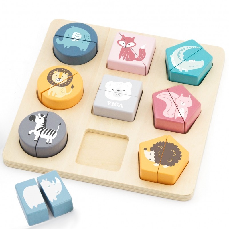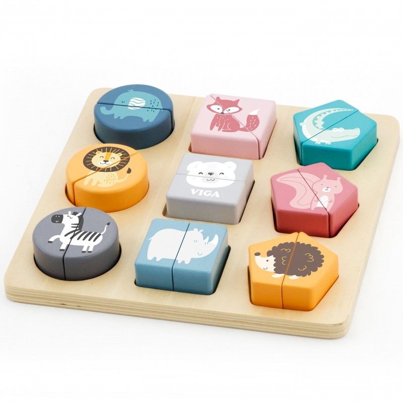 - - Każdy komplet składa się z 2 elementów. Dodatkowo, puzzle pomogą w nauce kształtów, kolorów i zwierzątek.