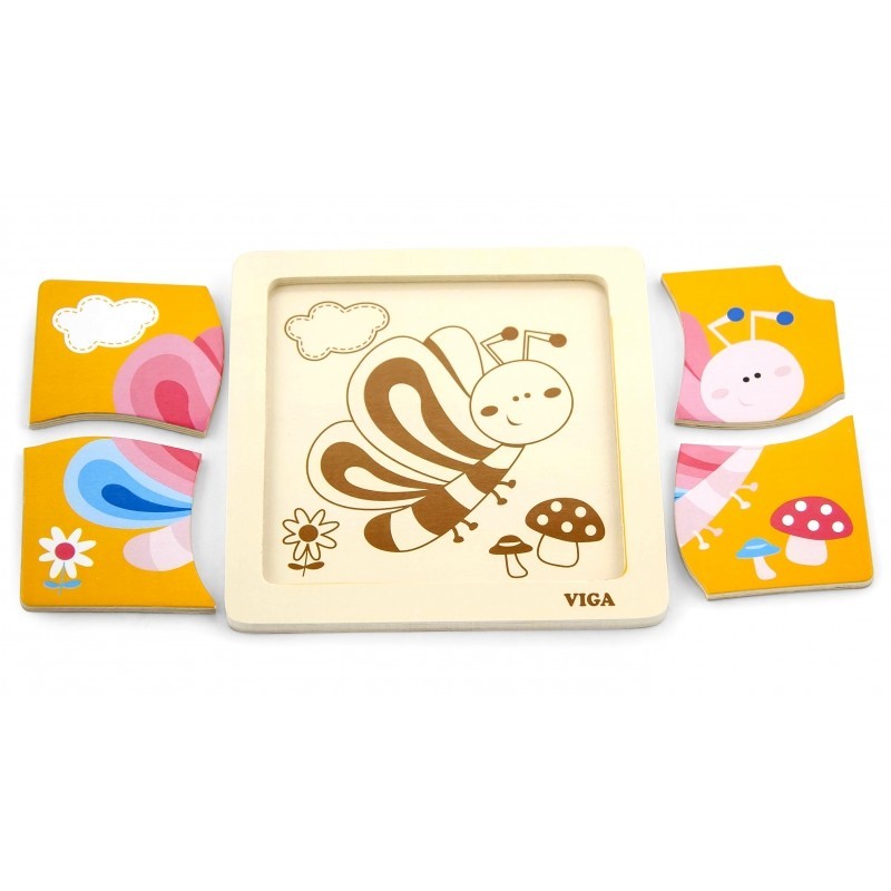 Drewniane Puzzle od Viga dla dzieci od 18 miesiąca życia to idealne rozwiązanie do domu, jak i do przedszkola. Składa się z planszy, oraz 4 elementów tematycznych, które należy do niej zamontować. Na drewnianej podstawce znajduje się narysowany gotowy obrazek, dzięki czemu dziecku jest łatwiej dopasować obrazek. Całość wykonana została z drewna, pomalowana bezpiecznymi dla dziecka farbami w żywe barwy, które zadowolą każdego użytkownika i dadzą mnóstwo radości z zabawy.