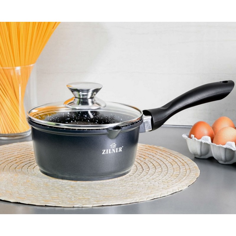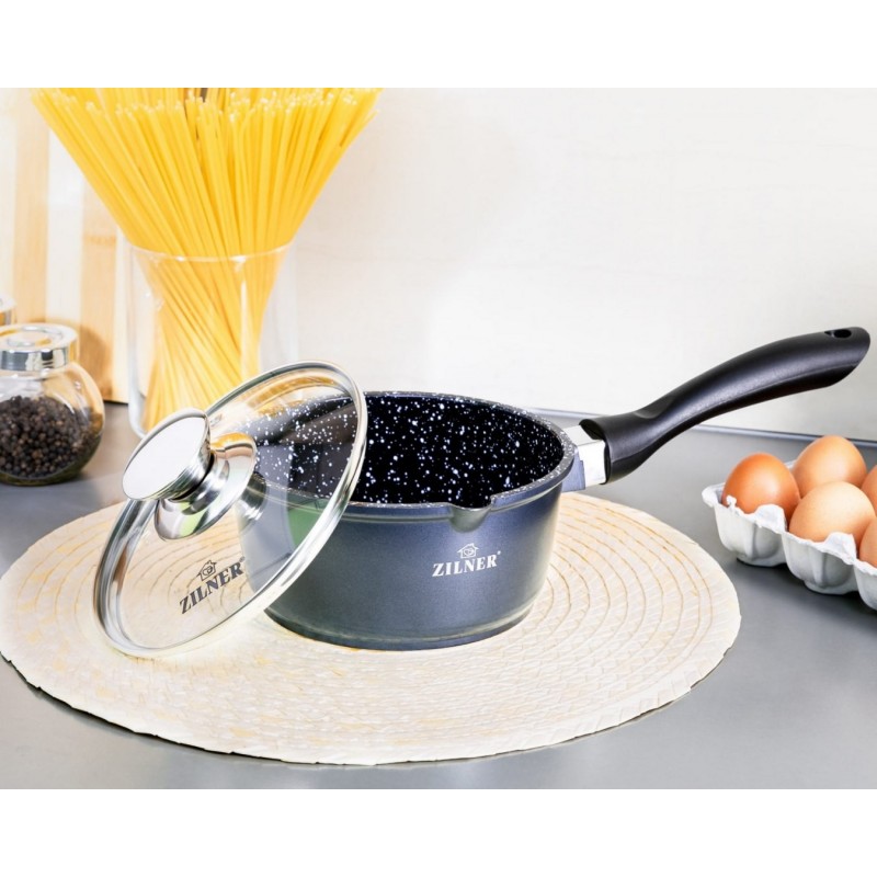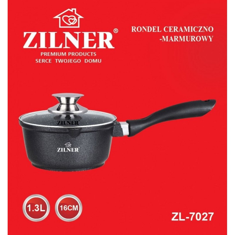 Wysokiej jakości rondelek marmurowy 16cm / 1.3L ze szklaną pokrywą ZILNER. Wykonany z odlewu aluminiowego pokrytego marmurową ceramiczną powłoką nieprzywierającą. Produkt z wytrzymałą, nieprzywieralną powłoką marmurową pozwala na zdrowe, beztłuszczowe gotowanie i łatwe mycie, a przede wszystkim chroni jedzenie przed przypaleniem. Zastosowany materiał perfekcyjnie utrzymuje i przewodzi ciepło.