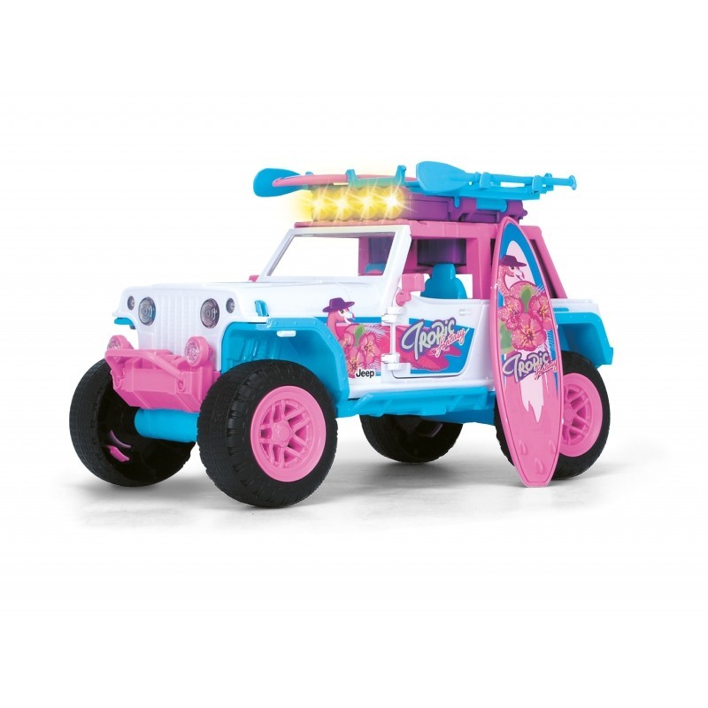 Playlife Pink Drivez Flamingo Jeep - Do wody! Słońce, plaża i morze - do tego właśnie jest stworzony ten fajny jeep z wolnym kołem od marki Dickie. Pojazd terenowy z wolnym kołem może być używany na nierównym terenie. Uderzające efekty świetlne i dźwiękowe oraz ponad 20 akcesoriów w tematyce morza i surfowania. Raz po raz mogą wymyślać nowe, kreatywne sytuacje do zabawy i wdrażać je za pomocą licznych akcesoriów.