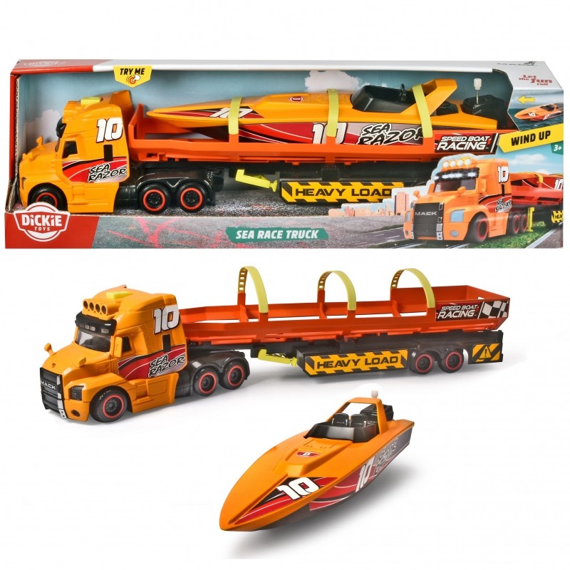 Ciężarówka z łodzią to sposób na wiele godzin zabawy. Na początku mamy zadanie załadować łódź na lawetę, przewieźć ją nad wodę, a następnie nakręcić silnik łódki i puścić ją na wodzie.