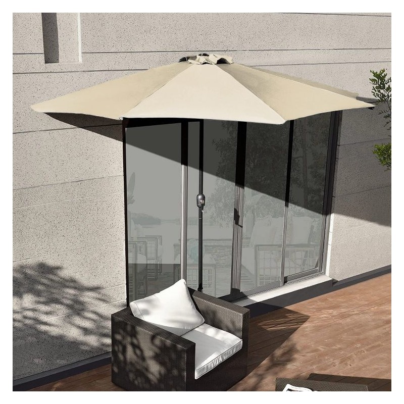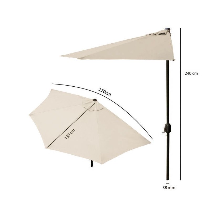Czasza parasola składa się z 5 segmentów, które tworzą powierzchnie o średnicy 2,7 metra. Wysokość maksymalna parasola to aż 240cm. Użyty materiał do wykonania parasola to wodoodporny poliester 180 g/㎡. Budowa parasola pozwala na postawienie go bezpośrednio przy ścianie lub na innej małej powierzchni. Parasol wyposażony został w korbkę, która pozwala na bezproblemowe rozłożenie i złożenie w krótkim czasie. Stelaż parasola wykonany został ze stalowej rury o średnicy 38mm, dzięki czemu można go zamontować w otworze stołów ogrodowych.