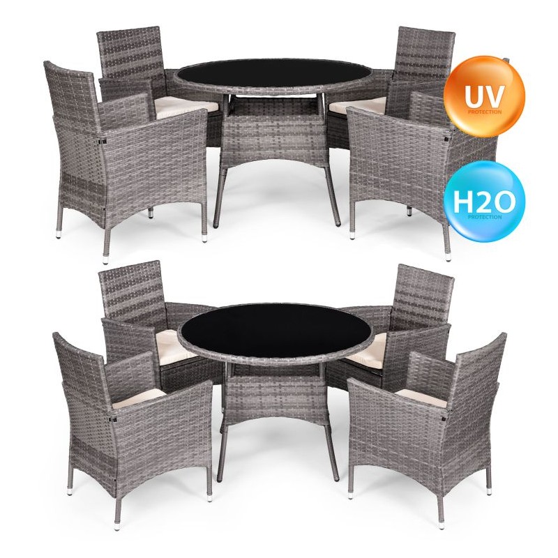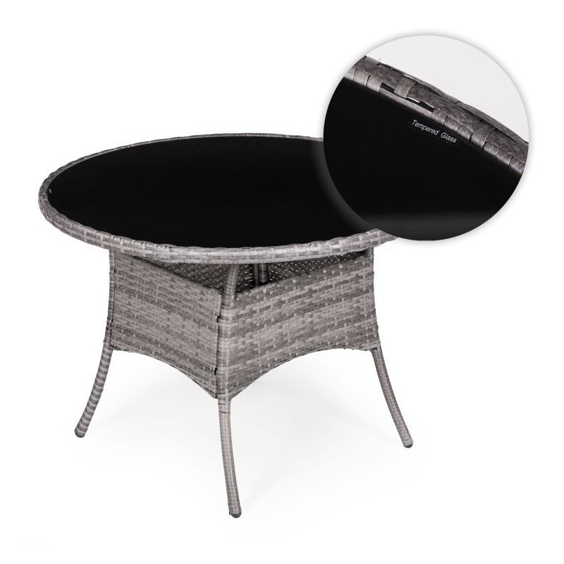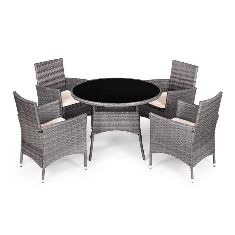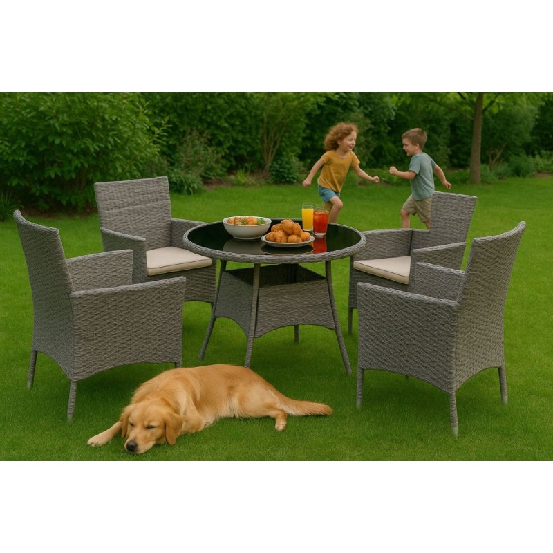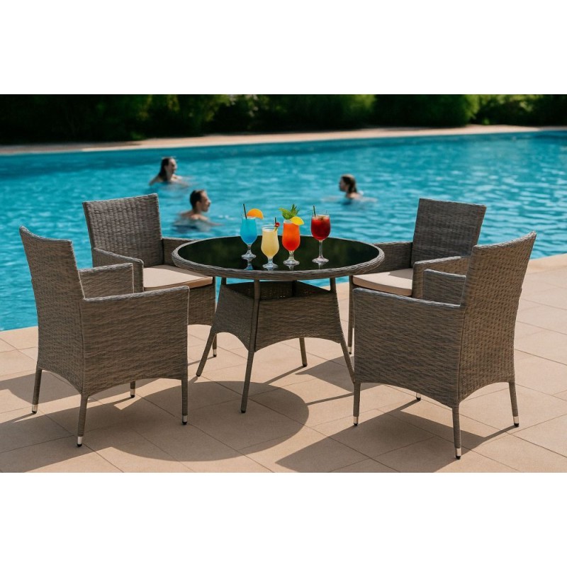 Stylowy zestaw mebli ogrodowych składa się z czterech krzeseł oraz stolika. Konstrukcja bazuje na solidnej stali pokrytej technorattanem, co zapewnia odporność na warunki atmosferyczne, długą żywotność oraz łatwe utrzymanie w czystości. Blat stolika z hartowanego szkła gwarantuje wysoką odporność na uszkodzenia.
