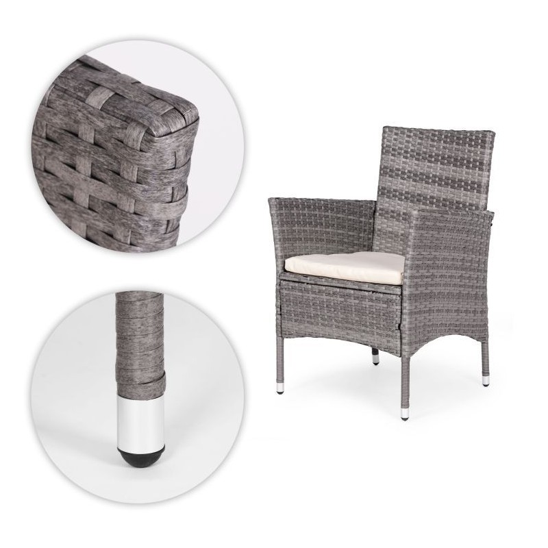 Miękkie poduszki na siedziskach wykonano z wodoodpornego poliestru o gramaturze 160 g/m². Nogi mebli wyposażono w antypoślizgowe stopki, które zwiększają stabilność. Maksymalne obciążenie krzeseł: 150 kg.