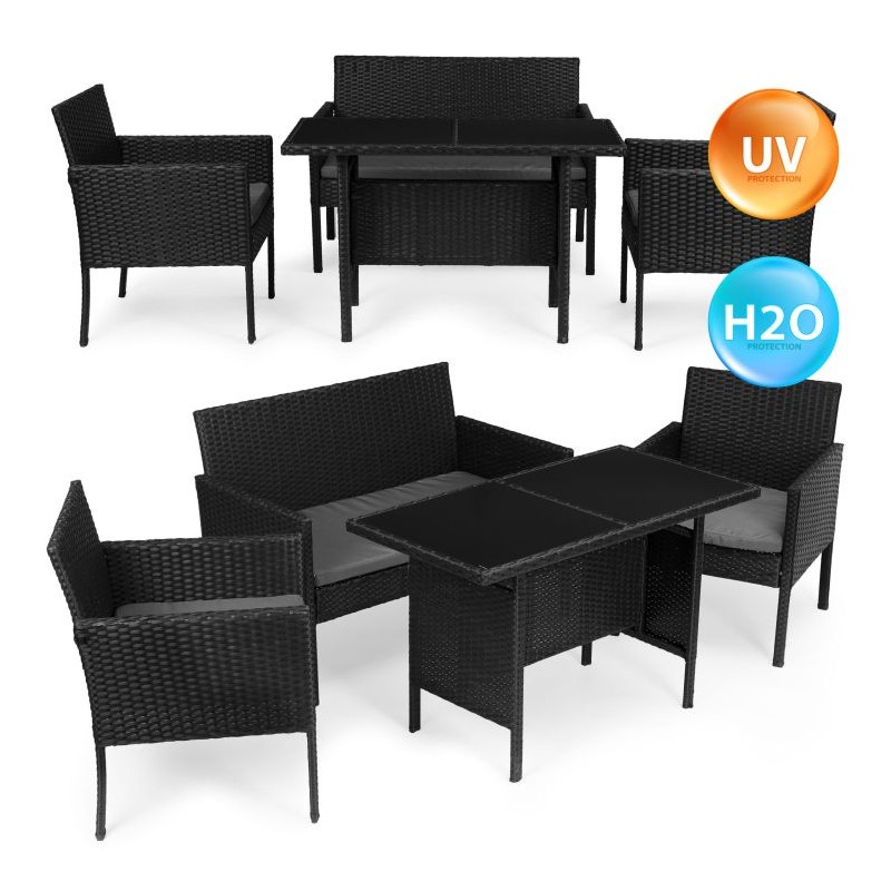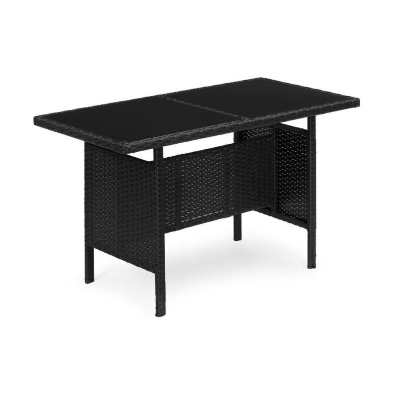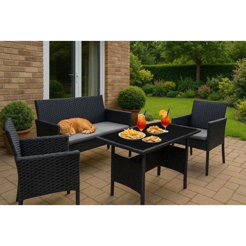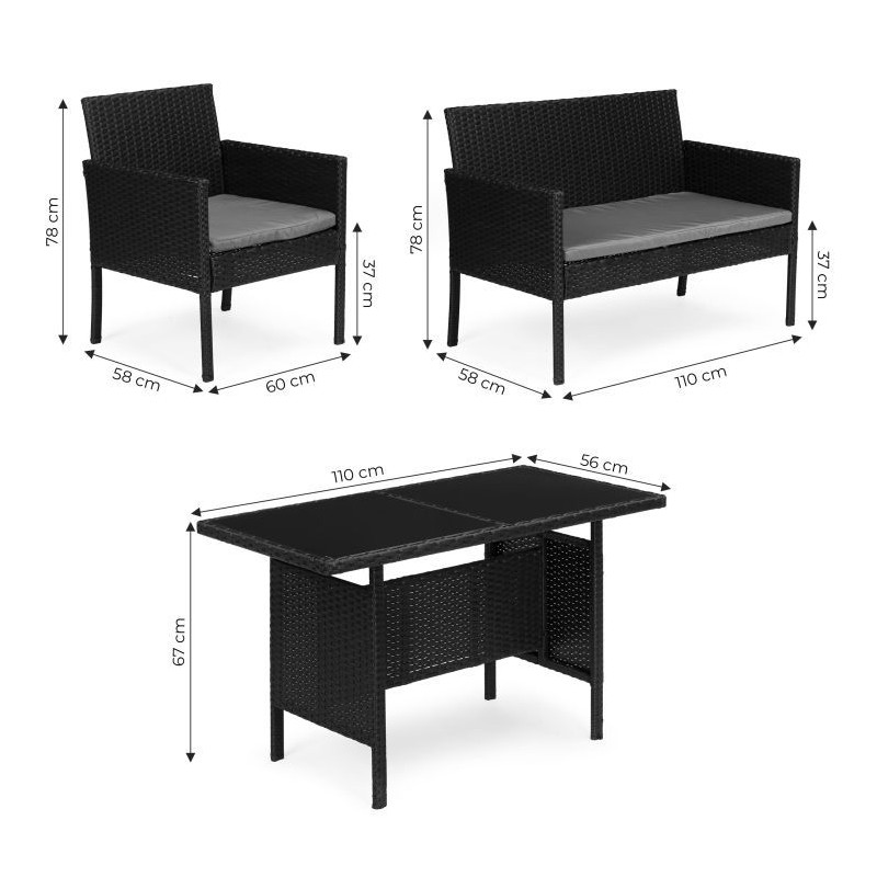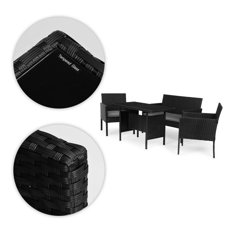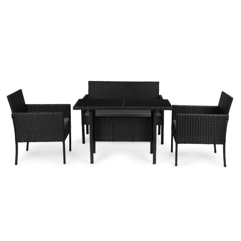Stylowy zestaw mebli ogrodowych składa się z ławki, dwóch krzeseł oraz stolika. Konstrukcja bazuje na solidnej stali pokrytej technorattanem, co zapewnia odporność na warunki atmosferyczne, długą żywotność oraz łatwe utrzymanie w czystości. Blat stolika z hartowanego szkła gwarantuje wysoką odporność na uszkodzenia. Miękkie poduszki na siedziskach wykonano z wodoodpornego poliestru o gramaturze 160 g/m². Maksymalne obciążenie: krzesła – 150 kg, ławka – 250 kg.