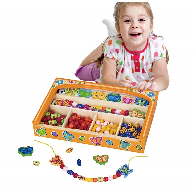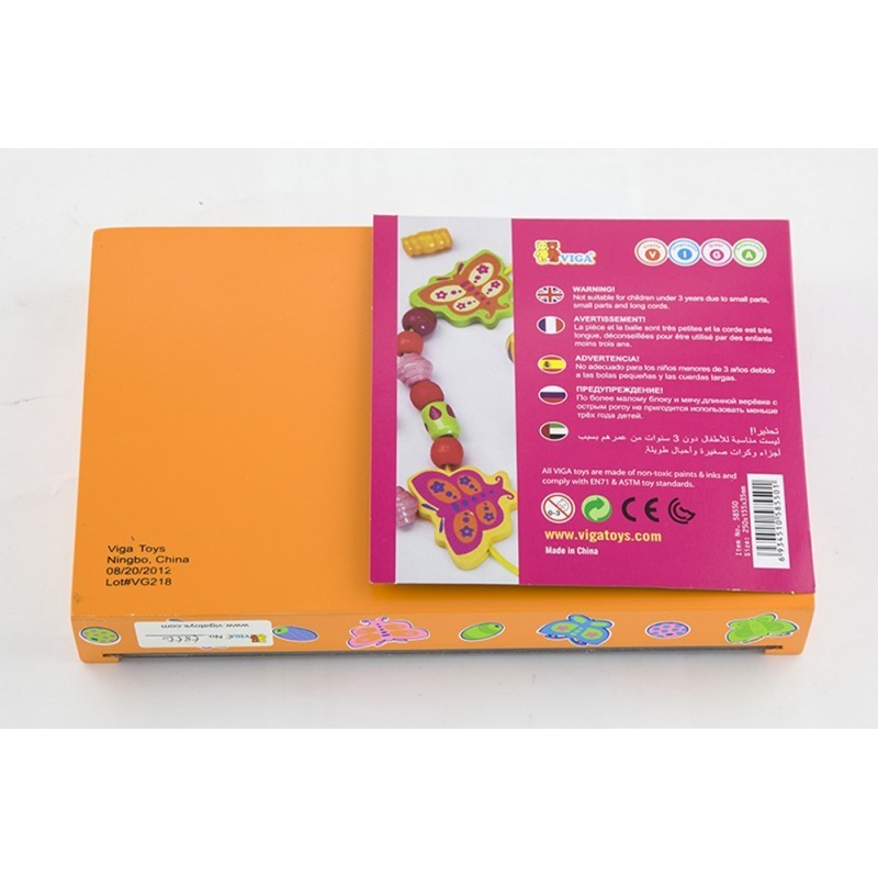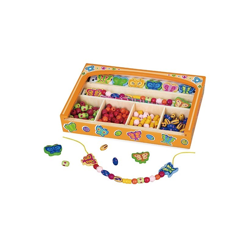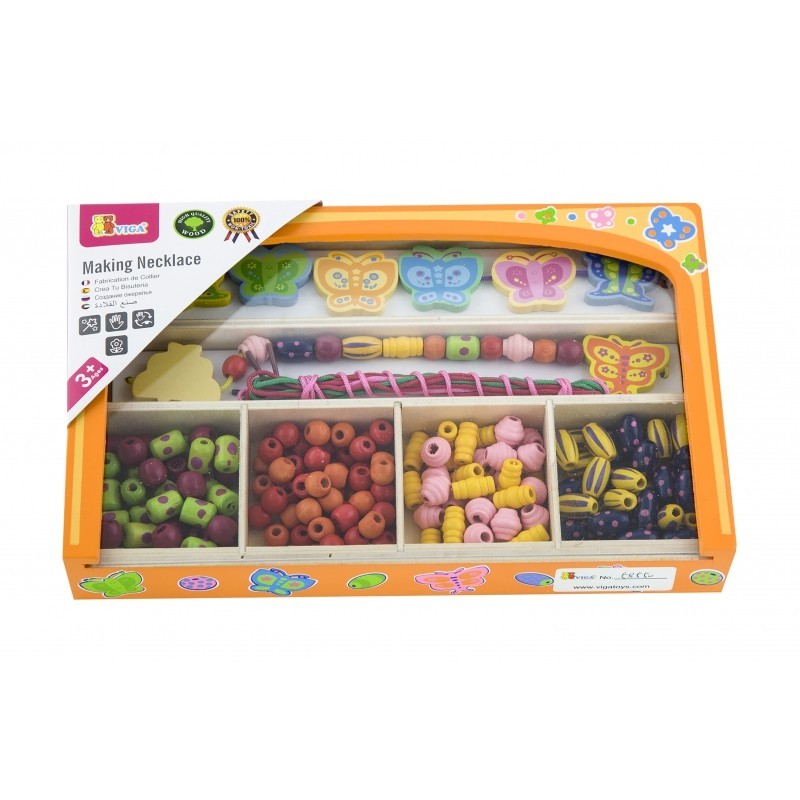 Drewniane koraliki do nawlekania firmy Viga Toys. Komplet składa się ze 180 koralików o różnych kolorach i kształtach, 5 kolorowych sznurków do nawlekania, oraz 8 dużych ozdób - motylków. Zabawka doskonale rozbudza kreatywność, gdyż dzieci mogą stworzyć wiele różnych bransoletek i naszyjników. Świetnie rozwija również koordynację wzrokowo-ruchową, ponieważ nawlekanie wymaga precyzji, cierpliwości, oraz skupienia.