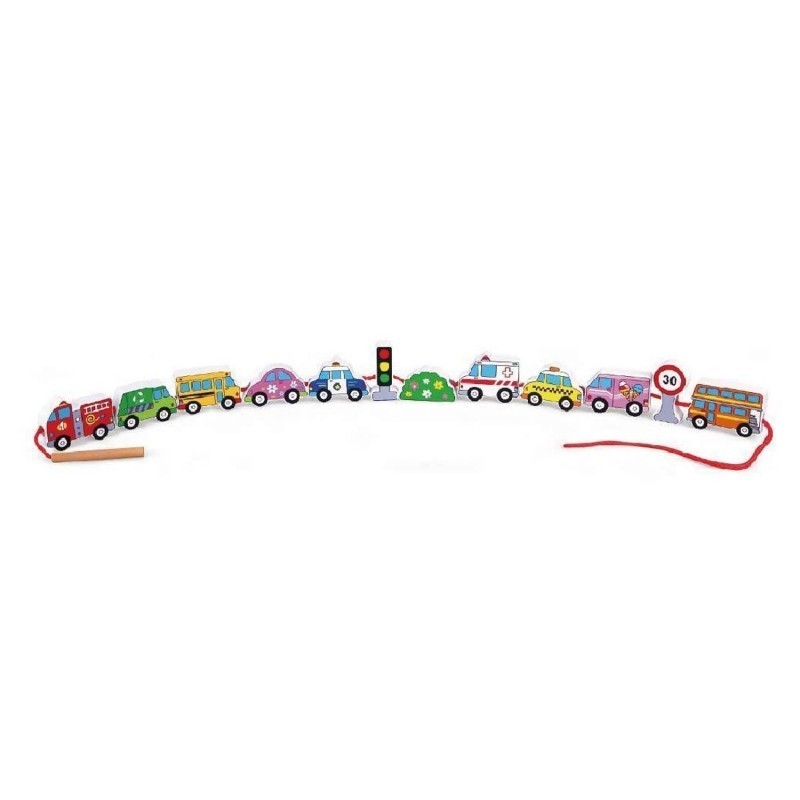 W zestawie 12 elementów, m.in.: autobusy, kolorowe samochodziki, radiowóz, znak drogowy, sygnalizacja świetlna i inne.