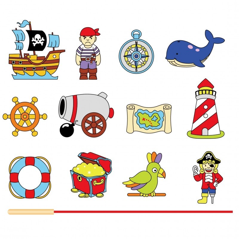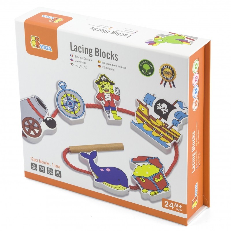 Piękne, kolorowe klocki do nawlekania zachęcają do zabawy. Każdy z 12 elementów został pomalowany dokładnie z obydwu stron. W zestawie znajduje się sznureczek z drewnianym kołeczkiem, który służy do nawlekania klocków w dowolnej kolejności. Klocki przedstawiają piratów, skarb, statek i papugę - wszystko, aby jak najszybciej wyruszyć na poszukiwania skarbu.