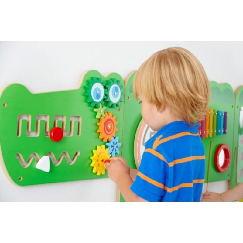 Pierwszy element, to głowa krokodyla. Tutaj maluch znajdzie labirynty przez które może prowadzić umieszczone elementy ćwicząc sprawność ruchową rączek i paluszków. Dodatkowo znajdziemy tu koła zębate, które wprowadzą w ruch oczy naszego krokodyla! Koła można dowolnie przekładać, szukając nowych możliwości rozmieszczenia.