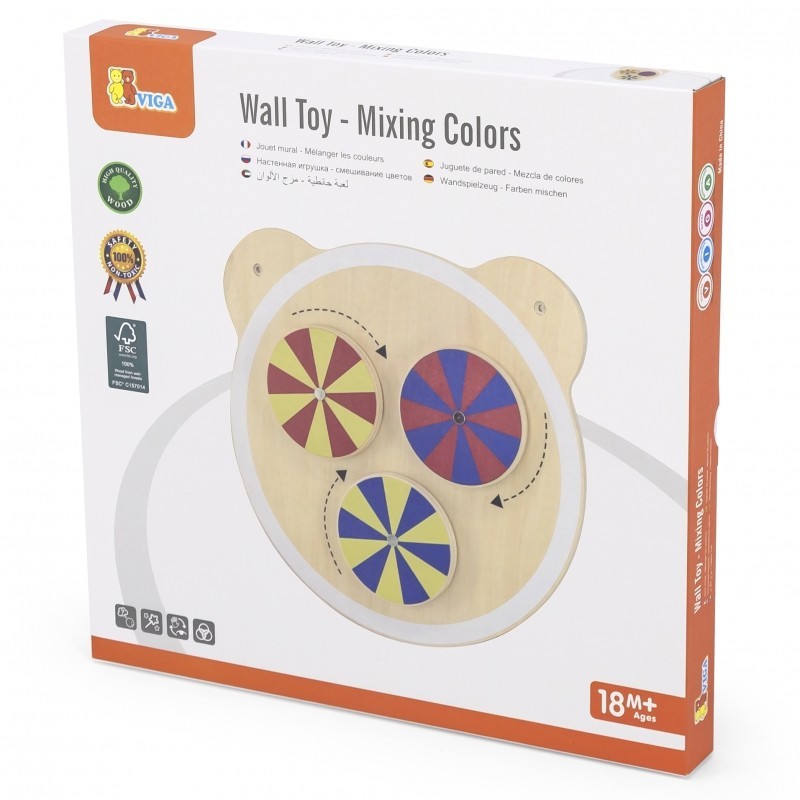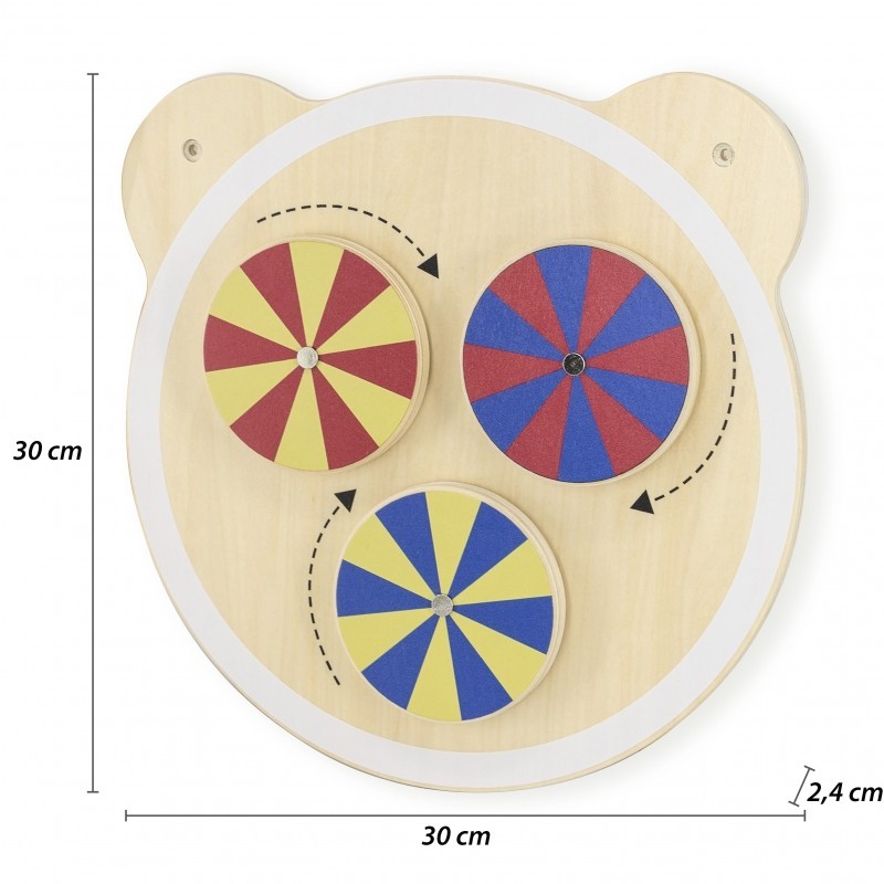 Jedna z serii drewnianych tablic z uroczą głową misia. Tablica z trzema kółkami, które zostały odpowiednio pomalowane, aby poprzez kręcenie wywoływać złudzenia optyczne. Zabawka pomaga w rozwijaniu logicznego myślenia u dzieci, pomaga również w nauce kolorów. Produkt idealnie sprawdzi się zarówno w domowym zaciszu, jak i w placówkach oświatowych, wczesnoszkolnych. Ciekawe przygotowanie formy tablicy z pewnością przykuje uwagę każdego malucha. Całość wykonana została z drewna lakierowanego i pomalowana nietoksycznymi farbami w żywe barwy, które zadowolą każdego użytkownika i dadzą mnóstwo radości z zabawy. Produkt przeznaczony dla dzieci od 18 miesiąca życia. W naszej ofercie dostępna jest cała seria tablic z głową misia.