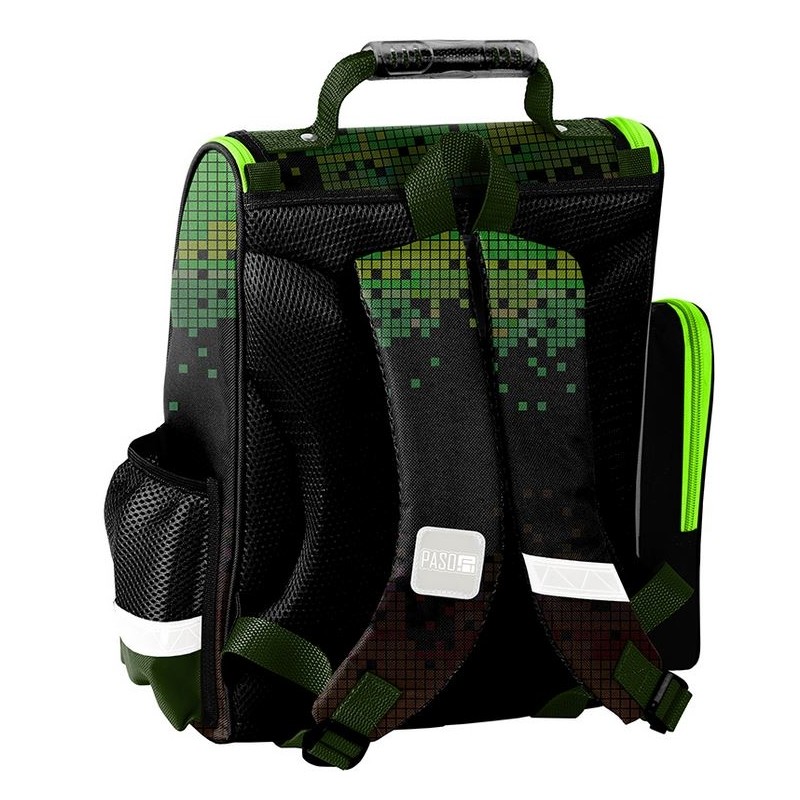Tornister posiada usztywniony spód oraz elementy odblaskowe.