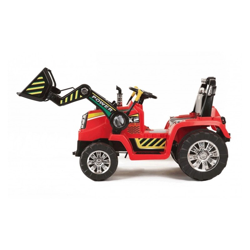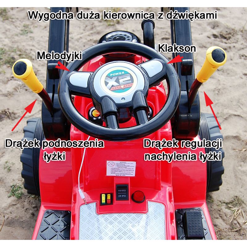 | Wymiary pojazdu: | długość całkowita mierzona z podniesioną łyżką ok: 124 cm,szerokość mierzona przy kołach tylnych 55,5 cm , wysokość przy kierownicy 59 cm, wysokość siedzenia ok.: 53,5 cm, szerokość siedziska:26 cm, siedzisko jest na wysokości 37 cm od ziemi, odległość od pedału gazu do siedzenia ok : 50 cm , średnica koła przedniego: 24 cm, szerokość koła przedniego 10 cm, średnica koła tylnego ok. 32 cm, szerokość koła tylnego ok.12 cm, prześwit od podłoża: ok: 12,5 cm, Łyżka ok. 38x:24 cm, głębokość 14 cm |
