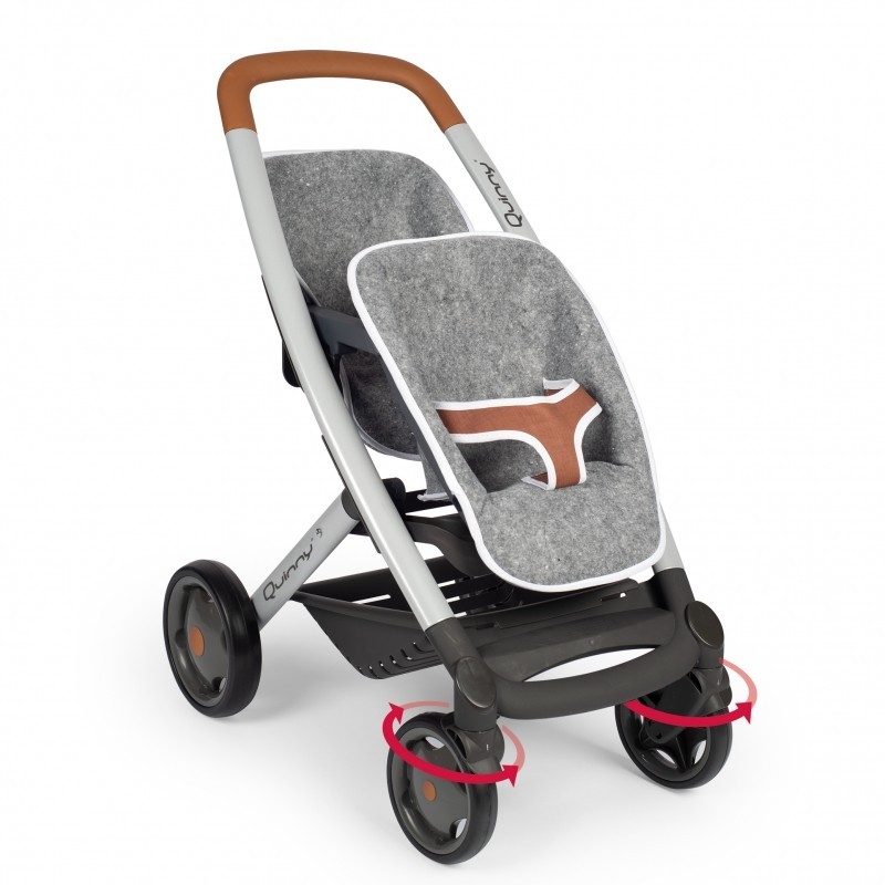 Wózek dla bliźniąt na licencji Maxi Cosi Quinny w kolorze szarym to idealny prezent dla dziewczynki posiadającej już swoją wymarzoną lalkę. Zestaw został wyposażony w ciche, piankowe kółka. Dodatkowo przednie kółka są skrętne dla wygodniejszego prowadzenia i skręcania. Zabawka posiada wygodny uchwyt, praktyczny koszyk na drobiazgi umieszczony pod spodem oraz szelki dla lalek, by nie wypadły.