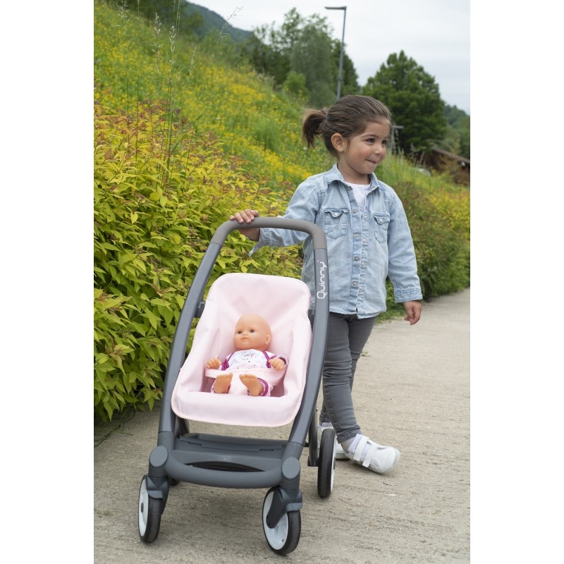Ten śliczny wielofunkcyjny wózek dla lalek stylizowany jest na wózkach Maxi Cosi Quinny o nowoczesnej stylistyce. Wózek jest niezwykle stabilny, a skrętne przednie kółka zapewniają łatwość prowadzenia i wygodę podczas zabawy. Ciche koła z gumowymi oponami wpływają na komfort jazdy. Wózek daje dziewczynkom możliwość urozmaiconej zabawy, dzięki opcji zmiany nadwozia na spacerówkę lub gondolę. Spacerówkę wyposażono w pasy bezpieczeństwa, którymi można zapiąć lalkę, gondolę natomiast w pokrowiec i opuszczany daszek. Stelaż wózka posiada wygodną rączkę, na wysokości 64 cm. Wózek przeznaczony dla lalek 42 cm.