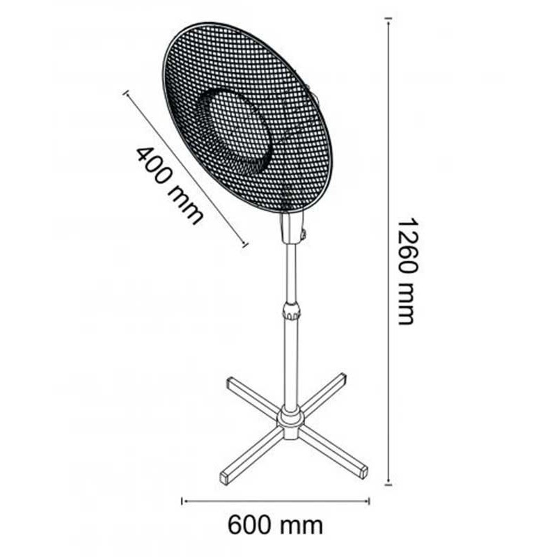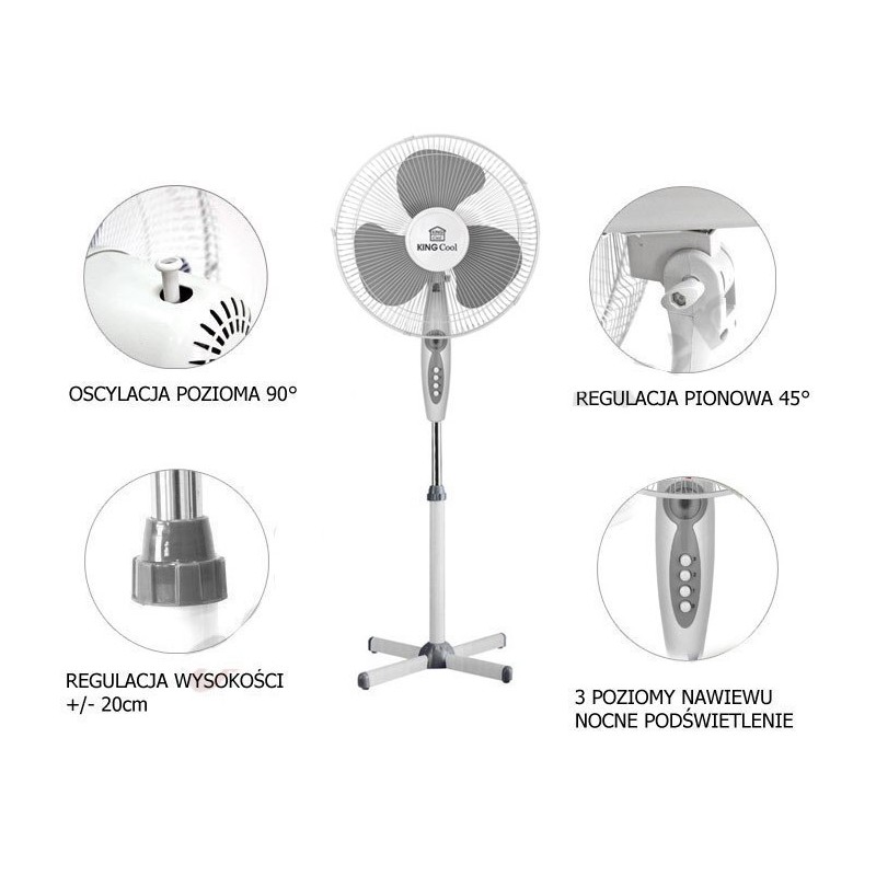 Łatwy w montażu, wentylator podłogowy, dający delikatne uczucie chłodu w upalne dni. Urządzenie posiada trzystopniową regulację prędkości nawiewu. Wyposażone jest w funkcję automatycznej oscylacji, dzięki czemu może obracać się w kierunkach bocznych. Zwiększa to zasięg oddziaływania urządzenia. Dodatkowo kierunek nadmuchu można regulować, zmieniając ręcznie kąt nachylenia głowicy. Solidna podstawa zapobiega upadkowi, a możliwość regulacji wysokości za pomocą rury teleskopowej, pozwala dodatkowo na ustawienie odpowiedniego pułapu nawiewu. Wbudowana lampka sygnalizuje pracę urządzenia.