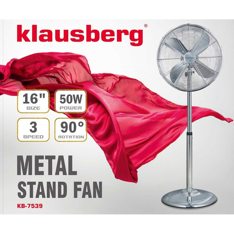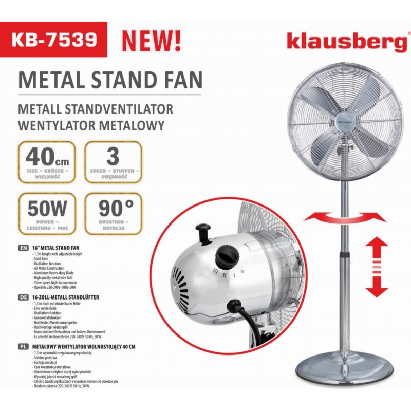 Łatwy w montażu, wentylator podłogowy, dający delikatne uczucie chłodu w upalne dni. Urządzenie posiada trzystopniową regulację prędkości nawiewu. Wyposażone jest w funkcję automatycznej oscylacji, dzięki czemu może obracać się w kierunkach bocznych. Zwiększa to zasięg oddziaływania urządzenia. Dodatkowo kierunek nadmuchu można regulować zmieniając ręcznie kąt nachylenia głowicy. Solidna podstawa zapobiega upadkowi, a możliwość regulacji wysokości za pomocą rury teleskopowej, pozwala dodatkowo na ustawienie odpowiedniego pułapu nawiewu. Wentylator wykonany jest z chromowanego metalu co nadaje mu elegancką, nowoczesną formę.