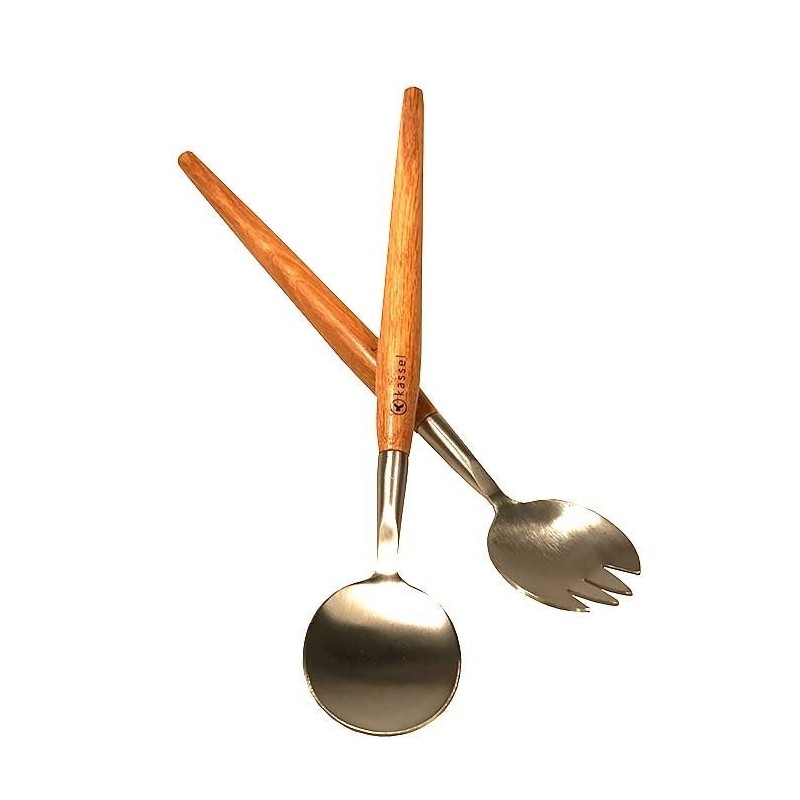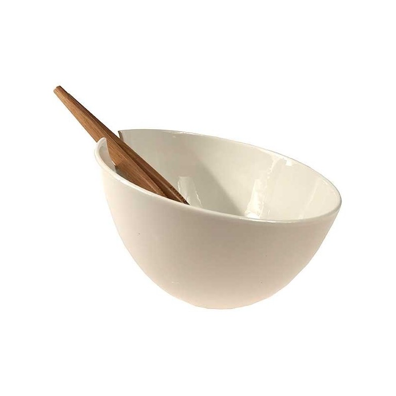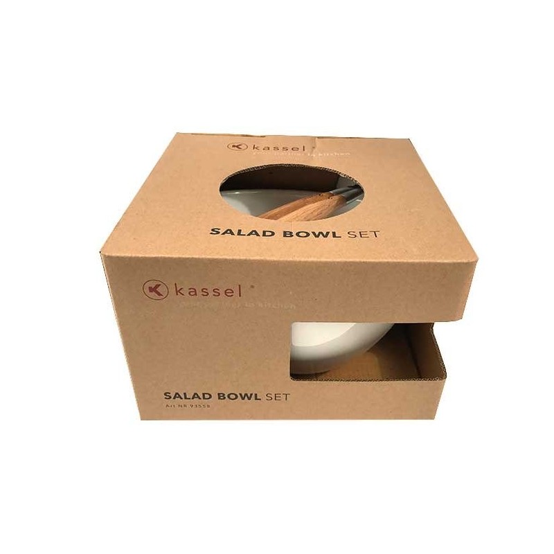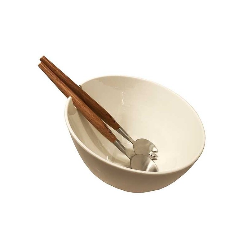 Porcelanowa miska KASSEL w kolorze białym. Idealna do serwowania sałatek. W zestawie 2 łyżki ze stali nierdzewnej z rączkami wykonanymi z drewna bukowego.