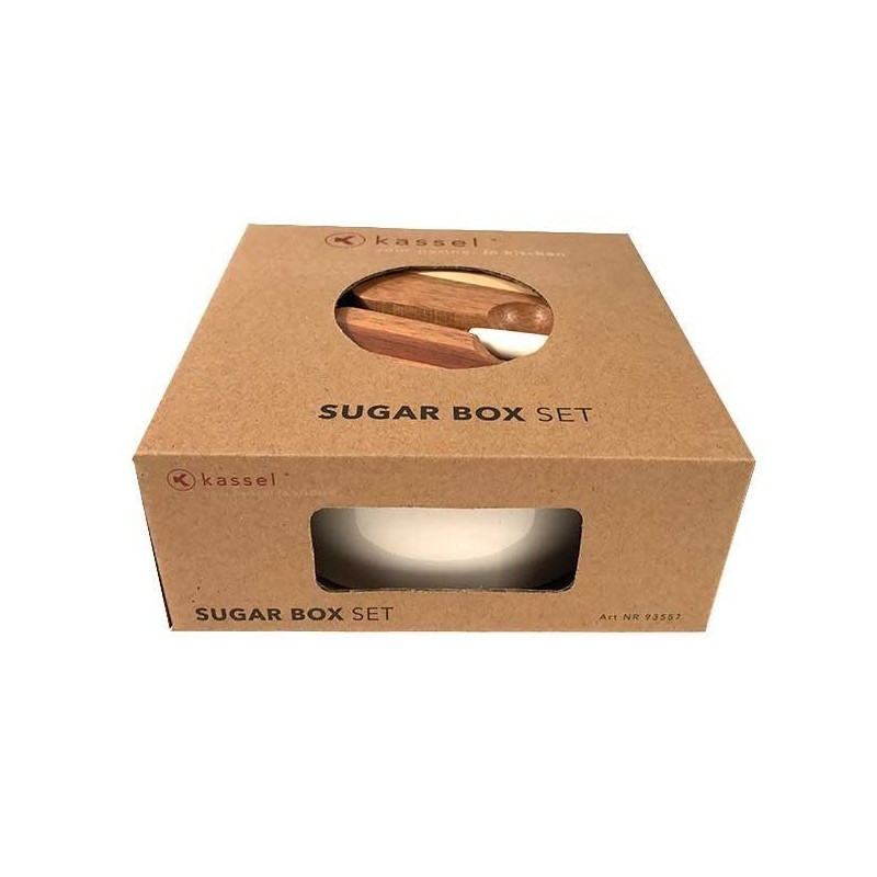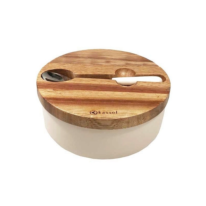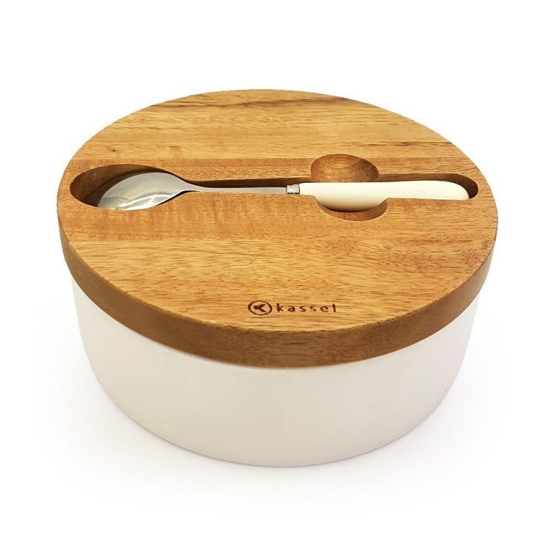 Porcelanowa cukiernica KASSEL w kolorze białym z pokrywą wykonaną z drewna akacjowego. W zestawie łyżeczka z porcelanową rękojeścią.