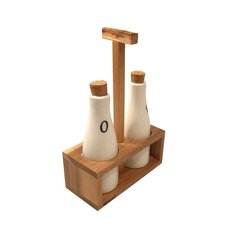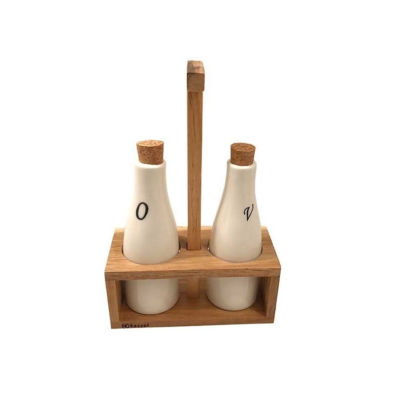 Przyprawnik na ocet i oliwę 2 w 1 KASSEL składający się z 2 porcelanowych butelek w kolorze białym w stojaczku z drewna akacjowego. Na butelki naniesione logo umożliwiające identyfikację zawartości. Butelki wyposażone w naturalne korki.