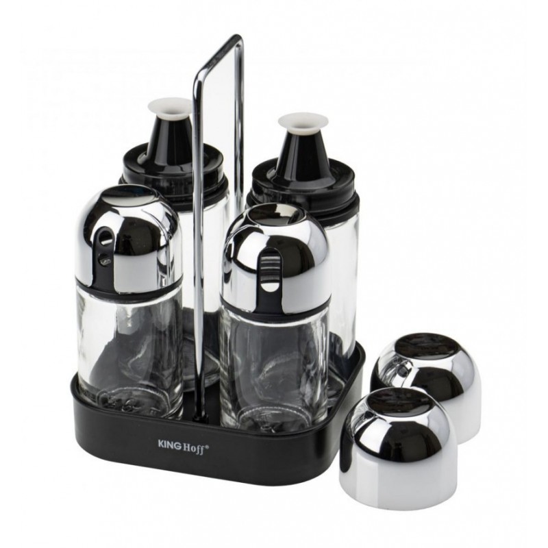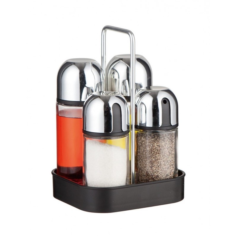 W zestawie znajdują się 2 dozowniki, solniczka, pieprzniczka i stojak.