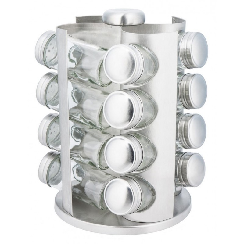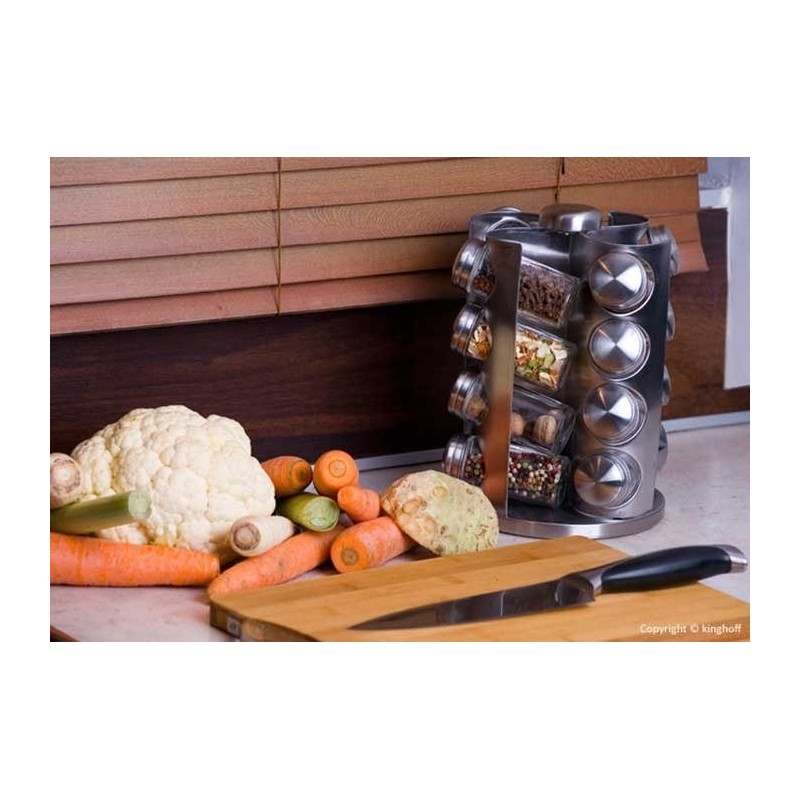 Zestaw 16 pojemników szklanych na obrotowym stojaku KINGHOFF wykonany ze stali nierdzewnej satynowej (INOX). Pojemniczki wykonane z grubego szkła, zamykane kapslem stalowym. Pod kapslem znajduje się zatyczka z dziurkami służąca do posypywania. Stojak obraca się na obrotowej podstawie wokół własnej osi 360 st.
