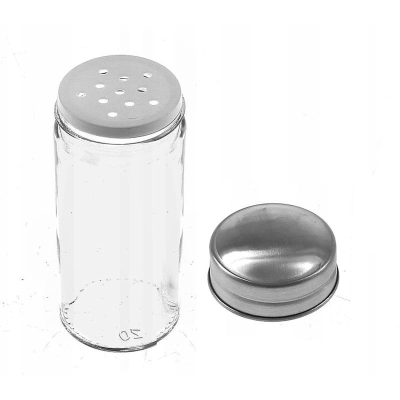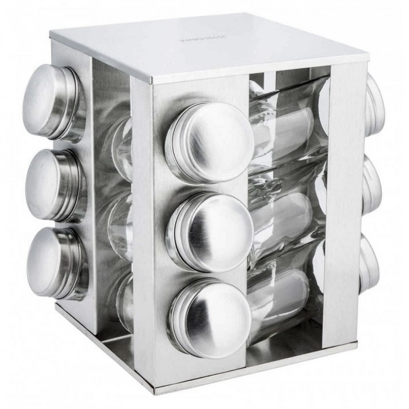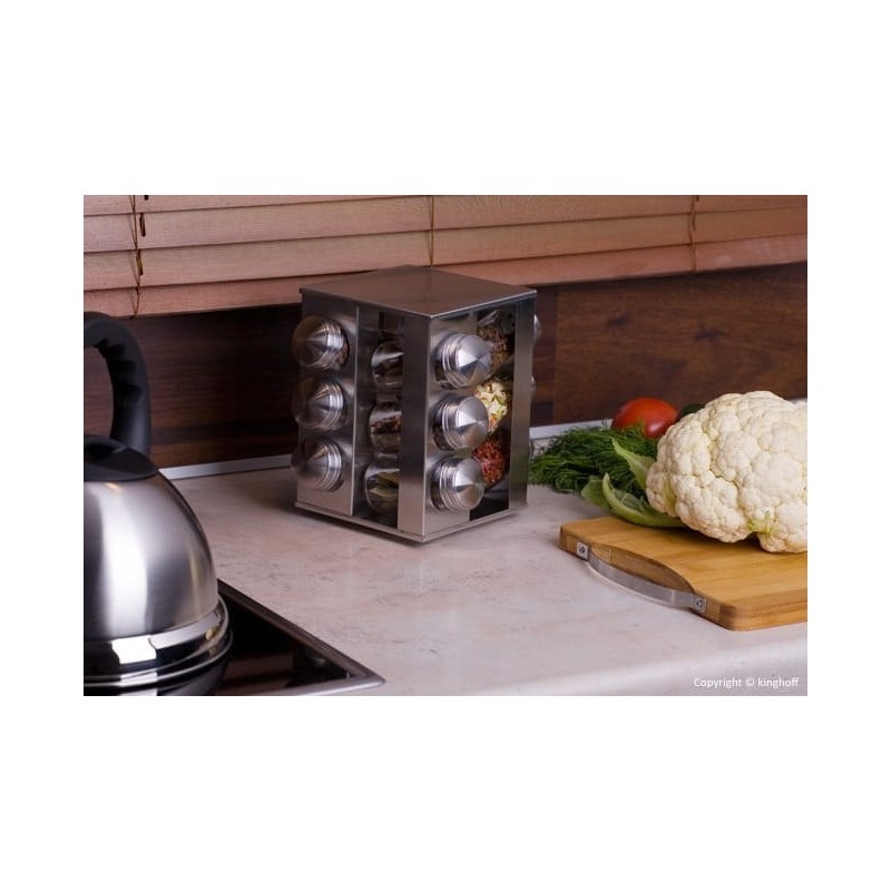 Zestaw 12 pojemników szklanych na obrotowym stojaku KINGHOFF wykonany ze stali nierdzewnej satynowej (INOX). Pojemniczki wykonane z grubego szkła, zamykane kapslem stalowym. Pod kapslem znajduje się zatyczka z dziurkami służąca do posypywania. Stojak obraca się na obrotowej podstawie wokół własnej osi 360 st.