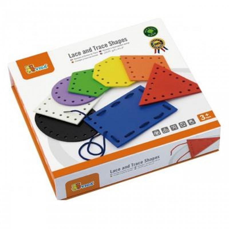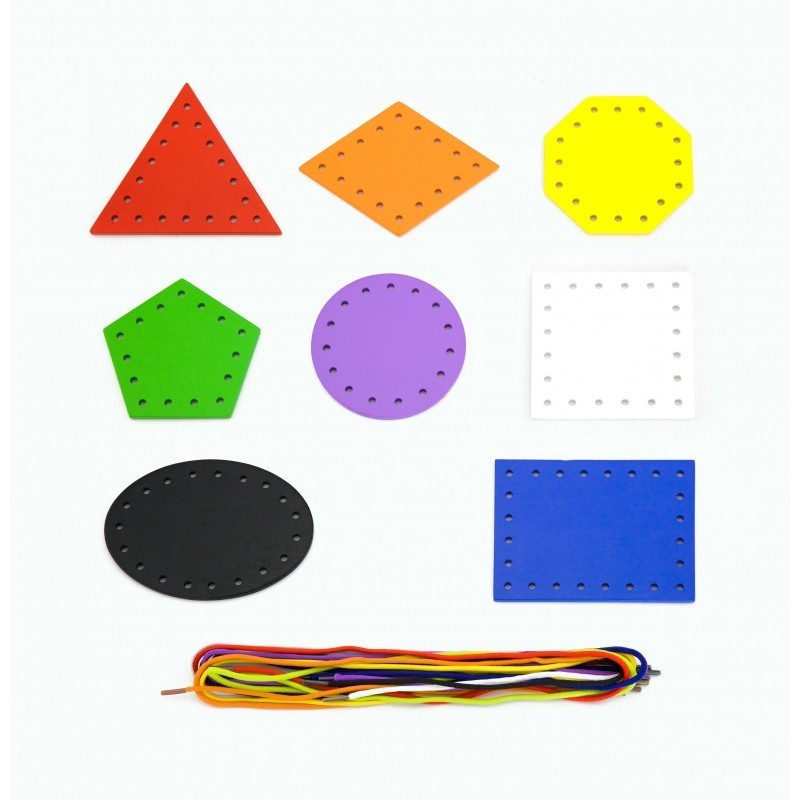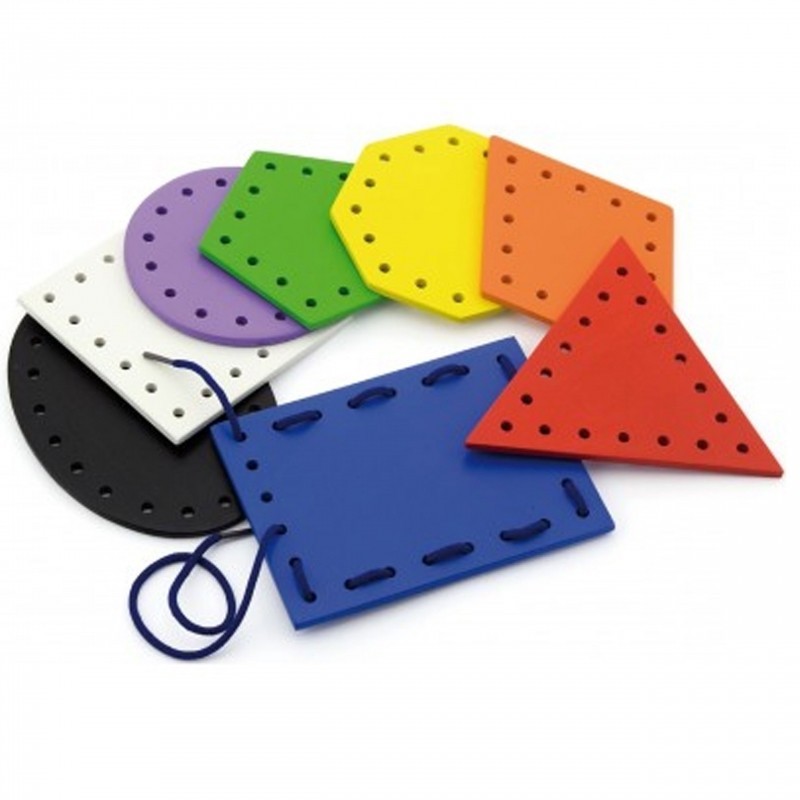 Zestaw zawiera 8 różnych kształtów w różnych kolorach oraz różne kolory sznurków. Zadaniem dziecka jest nawlekanie, sznurownie. Służą one do rozwijania zmysłu dotyku i wzroku, motoryki oraz koordynacji ręka-okoeksi.